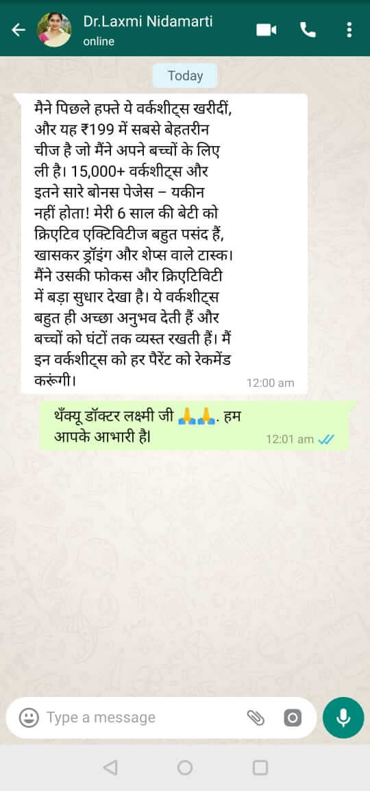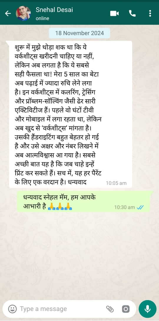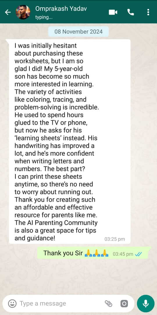 डॉ. राहुल कबीर वर्मा, जो कि बच्चों की शिक्षा और मस्तिष्क विकास के क्षेत्र में एक प्रतिष्ठित विशेषज्ञ हैं और YouTube Silver Play Button विजेता भी हैं—उन्होंने खुद Smart Parents Club द्वारा विकसित किया गया यह प्रोडक्ट अपने दो बच्चों के लिए उपयोग किया है।डॉ. वर्मा बताते हैं कि उनके बेटे अमन (7 वर्ष) और बेटी ऋचा (4 वर्ष) लॉकडाउन के बाद लगातार मोबाइल स्क्रीन पर समय बर्बाद कर रहे थे। उन्होंने कई उपाय किए, लेकिन स्क्रीन टाइम कम करना एक बड़ी चुनौती बन गया था।लेकिन जब उन्होंने AI Genius Brain Booster Worksheets और बच्चों के लिए एक्टिविटी आधारित कंटेंट का यह सेट उपयोग किया—तो उन्होंने अपने बच्चों में अविश्वसनीय बदलाव देखे।अब अमन और ऋचा मोबाइल की बजाय कलरफुल, गेम जैसी Worksheets और मस्तिष्क विकास वाली गतिविधियों में व्यस्त रहते हैं।डॉ. राहुल वर्मा कहते हैं:”Smart Parents Club का यह प्रोडक्ट केवल Worksheets नहीं, बल्कि एक विचारशील माता-पिता के लिए शांति और उम्मीद का जरिया है। इससे मेरे बच्चों की एकाग्रता, रचनात्मकता और सोचने की क्षमता में जो सुधार हुआ है, वह शब्दों में नहीं बताया जा सकता।”वे आज हर माता-पिता से आग्रह करते हैं:”अपने बच्चे की शुरुआती उम्र में मस्तिष्क विकास के इस सुनहरे अवसर में ज़रूर निवेश करें—और उन्हें स्क्रीन की लत से बचाकर एक रचनात्मक दिशा दें।”यदि आपने भी यह चिंता की है कि आपका बच्चा घंटों मोबाइल पर समय बर्बाद कर रहा है, तो डॉ. राहुल कबीर वर्मा का यह अनुभव आपके लिए एक स्पष्ट संकेत है—अब सही निर्णय लेने का समय है!